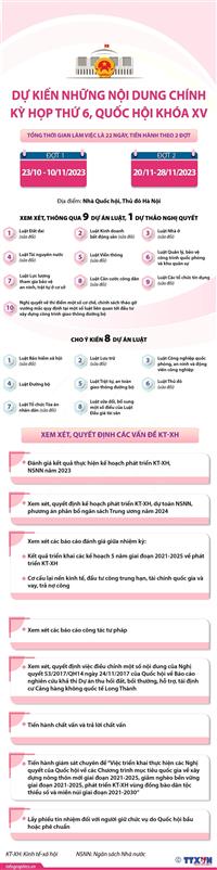 Kỳ họp thứ 6 Quốc hội khóa XV khai mạc trọng thể ngày 23/10, dự kiến bế mạc ngày 28/11 theo hình thức họp tập trung tại Nhà Quốc hội, Thủ đô Hà Nội. Xem thêm