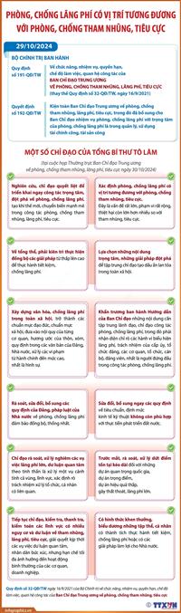 Ngày 30/10, tại Hà Nội, Tổng Bí thư Tô Lâm, Trưởng ban Chỉ đạo Trung ương về phòng, chống tham nhũng, lãng phí, tiêu cực chủ trì cuộc họp Thường trực Ban Chỉ đạo Trung ương về phòng, chống tham nhũng, lãng phí, tiêu cực. Xem thêm